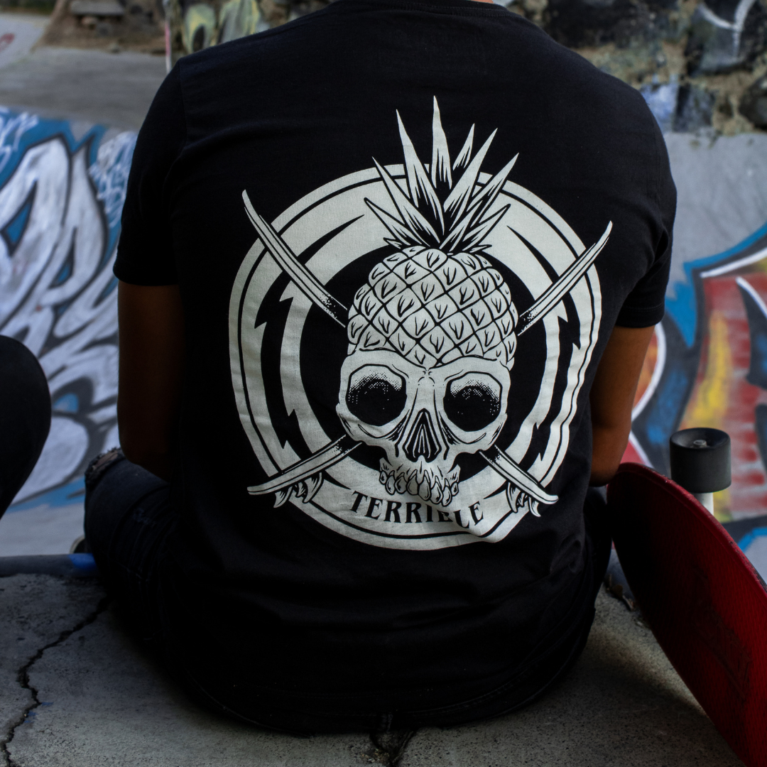 Playera Pineapple Skull unisex, color negro ,100% algodón peinado tallas S a XL con logo estampado en descarga "Pineapple Skull" lado izquierdo frontal y en espalda.