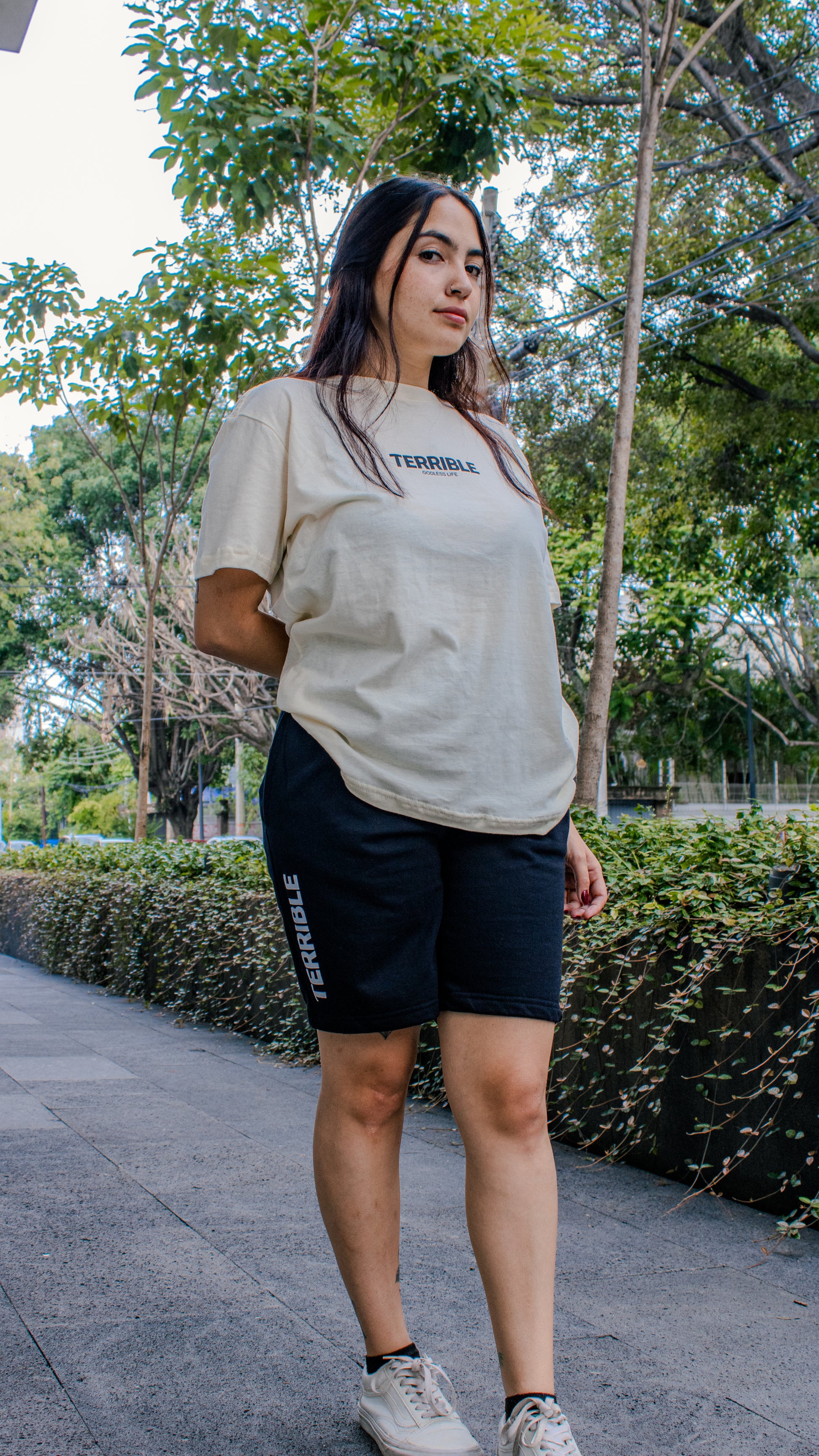 SHORT COLOR ALMENDRA IMPRESIÓN CON TINTA AHULADA COLOR NEGRO.