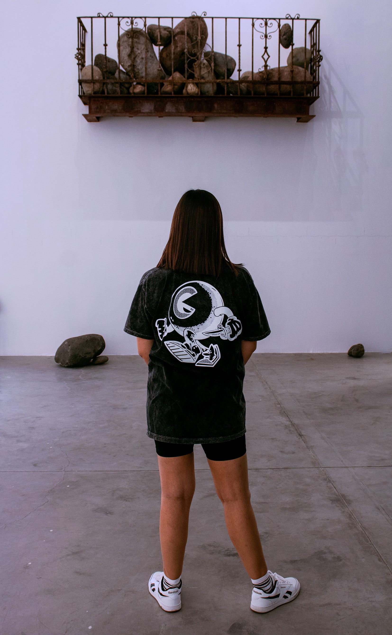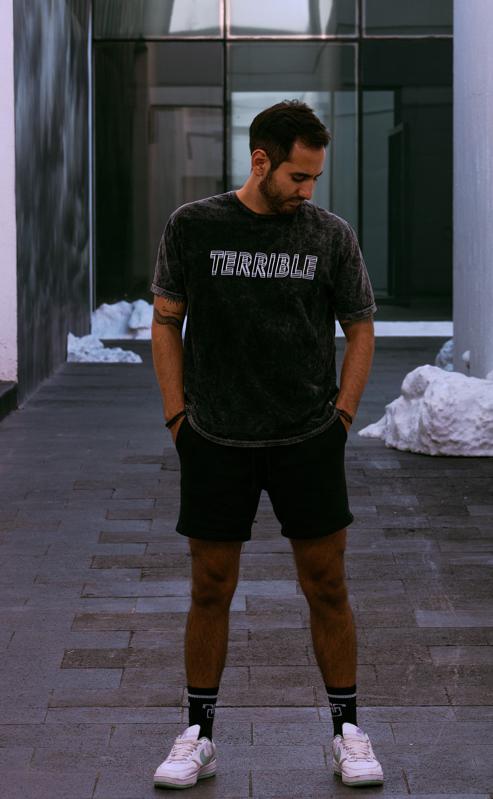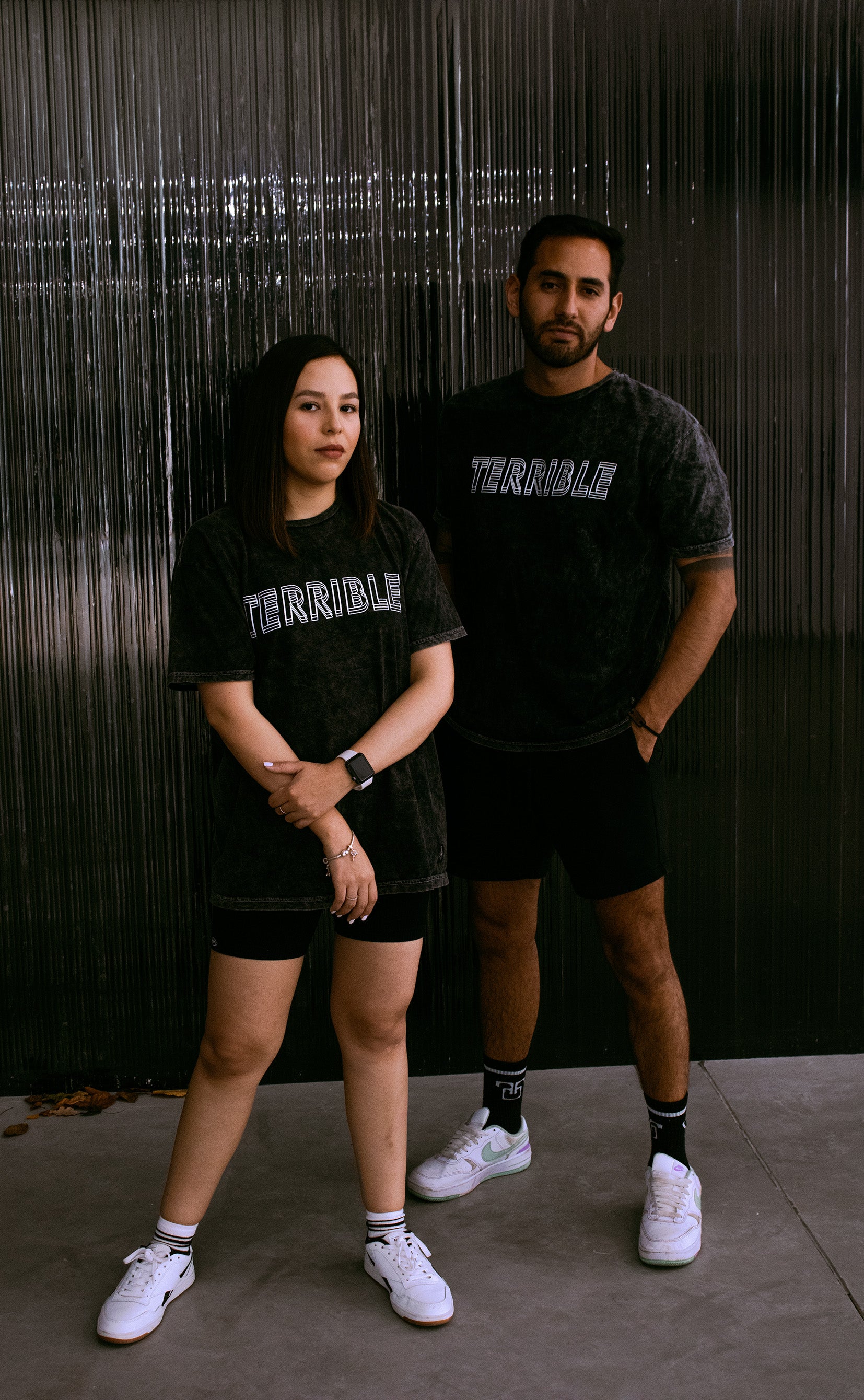 Playera 100 % algodón peinado bajo el proceso de acid wash, con impresión en ahulado “TERRIBLE” al frente “OJO” atrás.